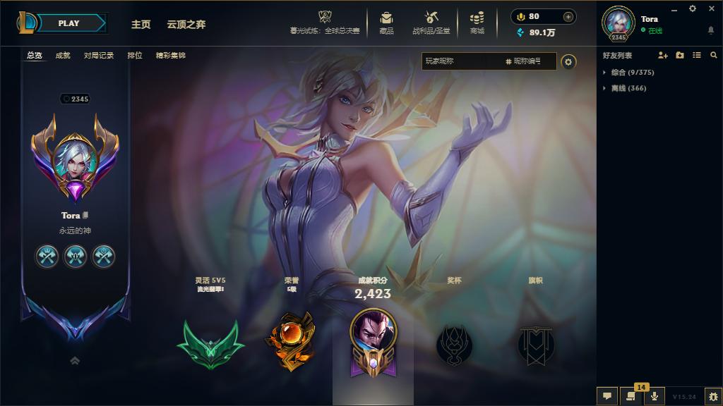 角色等级:2344 角色名:Tora 排位赛:允许 单双排段位:流光翡翠II 灵活组排段位:流光翡翠I 英雄数量:172 皮肤数量:1064 云顶段位:无段位 分销起租时长:1