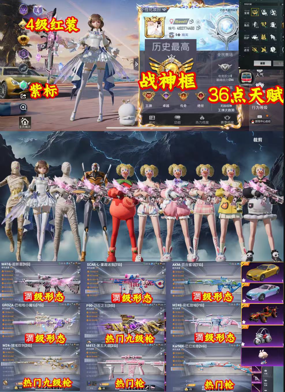 适配系统:苹果 红装数量:2 账号类型(腾讯):QQ 分销起租时长:1 载具数量:5 粉色时装数:30 套装数量:199 特效枪数量:15 枪皮数量:132