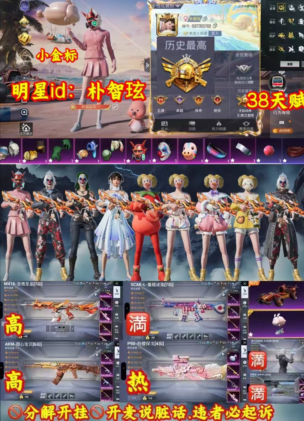 适配系统:苹果 账号类型(腾讯):微信 分销起租时长:1 载具数量:1 粉色时装数:30 套装数量:198 特效枪数量:15 枪皮数量:146