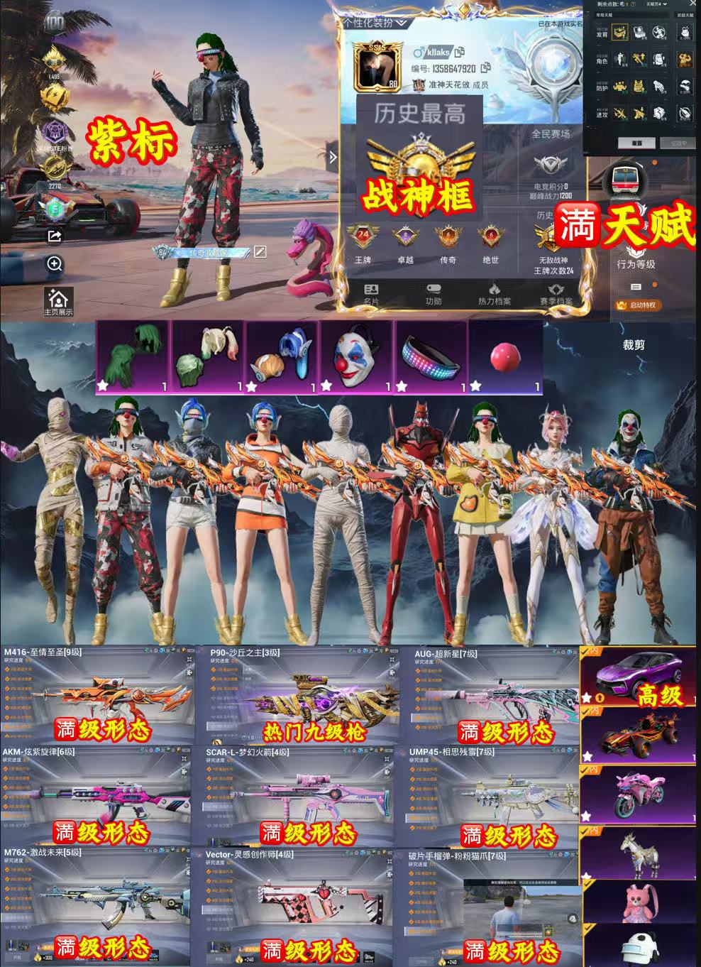 适配系统:苹果 账号类型(腾讯):微信 分销起租时长:1 载具数量:4 粉色时装数:23 套装数量:178 特效枪数量:15 枪皮数量:187