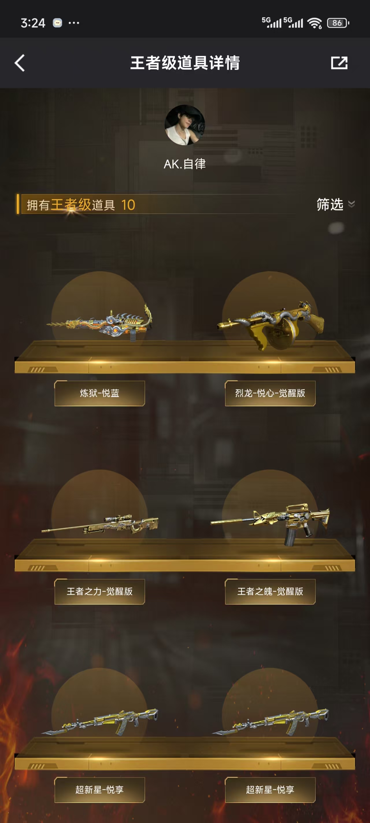 英雄武器数:63 王者武器数:10 枪王排位等级:荣耀枪王 账号类型:爆破号 到时不下线:0 分销起租时长:1 段位积分:4074 排位赛:允许 VIP等级:无