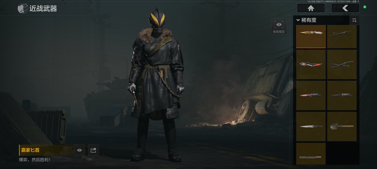 1.2w氪金9刀16皮9金枪,赢家匕首,三尺万仞战术剑,贝利亚黄昏,明刀绣春,瑞兔折刀,野战折刀,突击匕首