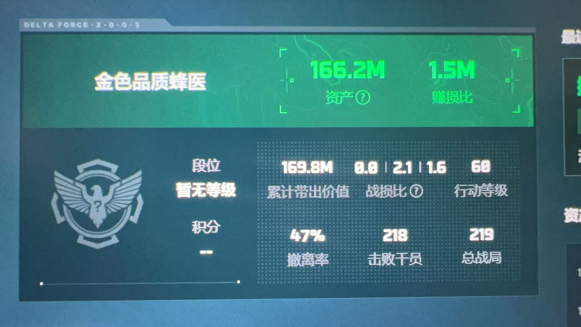 哈夫币比例:20 烽火地带等级:60 全面战场段位:上等兵 负重等级:6级 典藏皮肤数:0 哈夫币:145485239 载具皮肤数:1 AWM红弹数量:0 角色名:金色品质蜂医 六套装备数量:0 烽火地带段位:青铜 干员数:10 仓库物品处理:请先处理好仓库和收藏室内物品防止恶意消耗 体力等级:6级 普通皮肤数:37